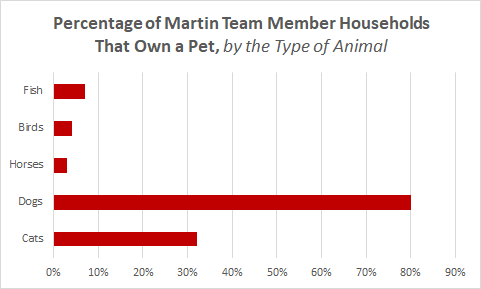 Other pets owned by Martin Team Members include a hedgehog, lizards, a bearded dragon, chickens, a duck and Nigerian dwarf goats! And, 5% of the 128 surveyed had more than 6 pets!